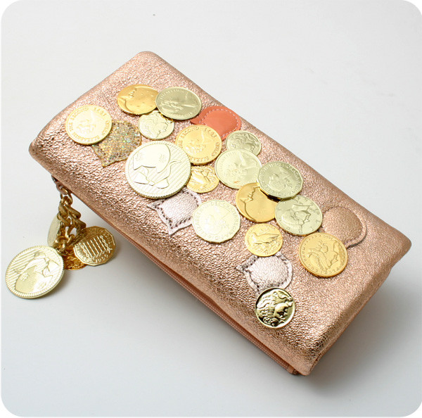 日本代购!森津千里表面镶金币华丽别致羊皮长款钱包