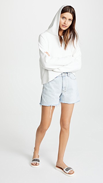 Alexander Wang 这款 “Bite” 高腰短裤以浅蓝色牛仔布制于日本,褪色、刷纹设计和手工做旧的毛边裤脚合力带来久穿爱物般的复古气息。