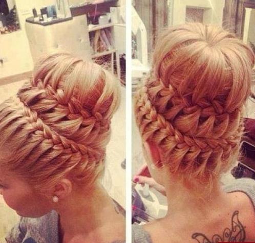【芭蕾发髻盘发】 ———— 步骤1:从上分两片一到二英寸的发髻下来,拉到马尾后用松紧带固定住。 步骤2:从正面拉出1英寸的头发扎马尾辫,然后编织两边。 步骤3:继续编织,把小马尾都包裹住。 步骤4:留出发髻,用发夹固定住,再通过发胶定型。
